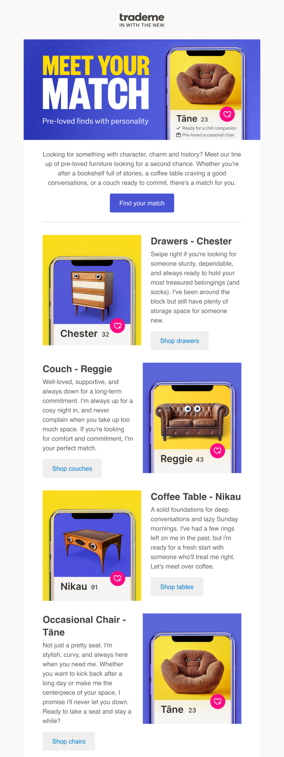 A playful campaign inspired by dating apps, reframing second hand shopping as an act of connection rather than compromise. The work used humour and character led storytelling to encourage people to see value in what already exists, supporting more sustainable choices and extending the life of everyday items.